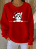 Women's Christmas Hat Cat Ribbed Round-Neck Sweatshirt